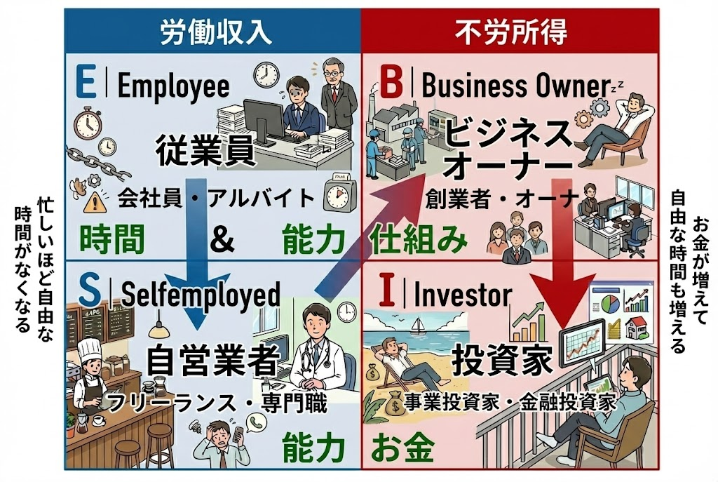 - I(Investor / 投資家): 資産を投じてお金に働いてもらい、配当・利息や売却益などで収入を得る人。 株式投資や不動産投資、事業への出資などによって資産収入(不労所得)を得る立場です。