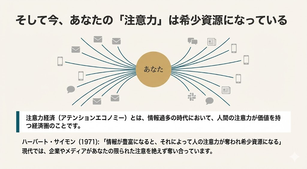 - 認知資源は有限であり、現代は注意力経済によって常に分断されている