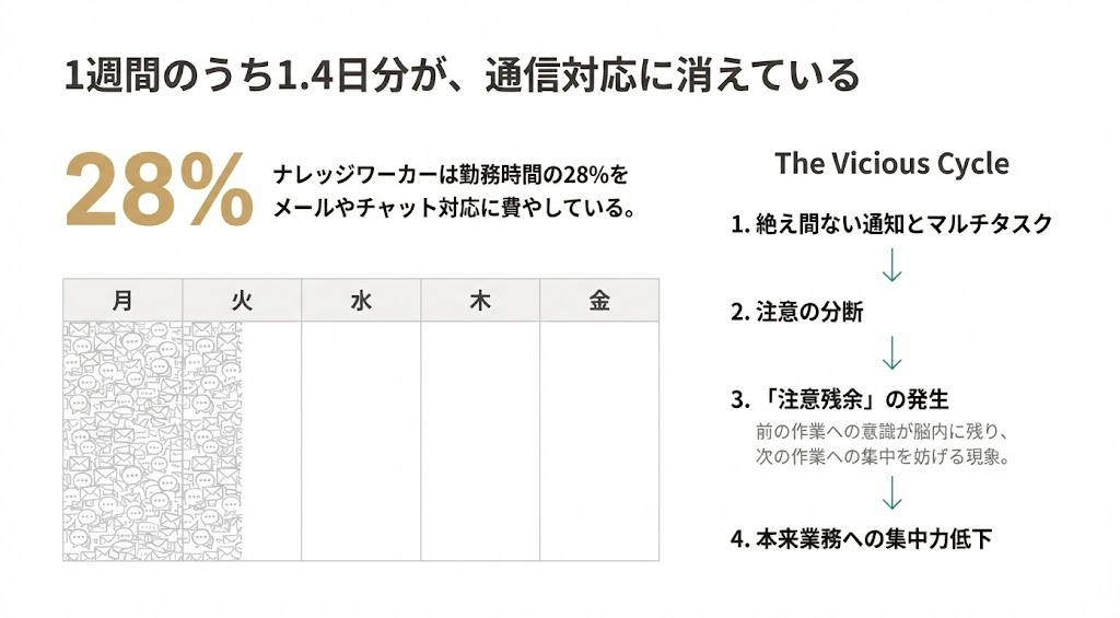現代のビジネス環境は、まさに「集中力の奪い合い」が日常化した時代です。オフィスでは朝から膨大なEメールやチャット(SlackやTeamsなど)が飛び交い、スマートフォンにはSNSやニュースの通知が次々と表示されます。会議中でさえ別件のメッセージが届き、対応を求められることもしばしばです。マルチタスクが常態化し、「仕事中に絶えず何かに呼び出され、注意を奪われる」状況はもはや特別なことではなくなっています。実際、ある調査によればナレッジワーカー(知的労働者)は勤務時間の約28%をメールやチャット対応に費やしていると言います。これは週5日働く場合、1週間のうち1.4日分もの時間が通信対応に消えている計算です。これだけの時間と注意が日々細切れに奪われているのですから、肝心の本来業務に集中できる時間は自ずと減少してしまいます。