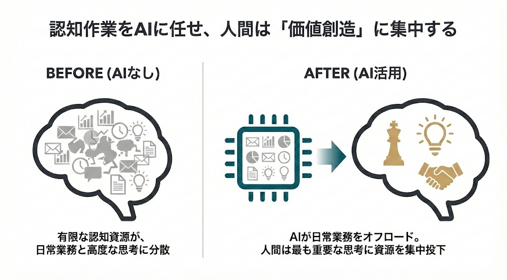 - 生成AIは単なる時短ツールではなく、認知資源を再配分する戦略装置