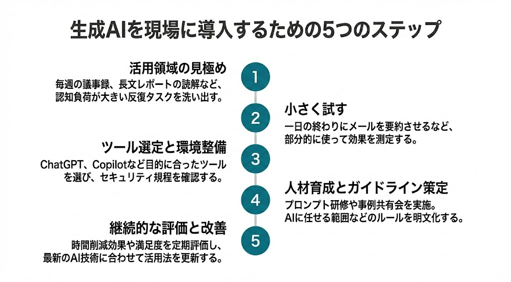 生成AIの有用性が理解できたところで、次に具体的に職場へ導入する方法を考えてみましょう。闇雲に「AIを使え!」と言われても、何から始めれば良いかわからないという方も多いはずです。以下では、ビジネスパーソンが生成AI(例えばChatGPT)を活用する際の実践的なステップやポイントを示します。