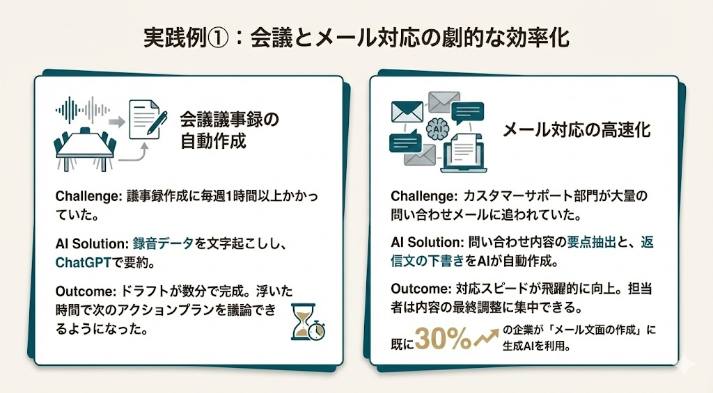 - 事例1:会議議事録の自動作成 – とある企業では、週次会議のたびに議事録作成に1時間以上取られていました。そこで録音データを文字起こしし、そのテキストをChatGPTに要約させる運用に切り替えたところ、議事録ドラフトが数分で完成するようになりました。担当者は清書と内容確認だけ行えばよく、毎週の負担が大幅に減少しました。浮いた時間で会議内容をチーム内で議論し、次のアクションプラン策定に充てられるようになったのです。