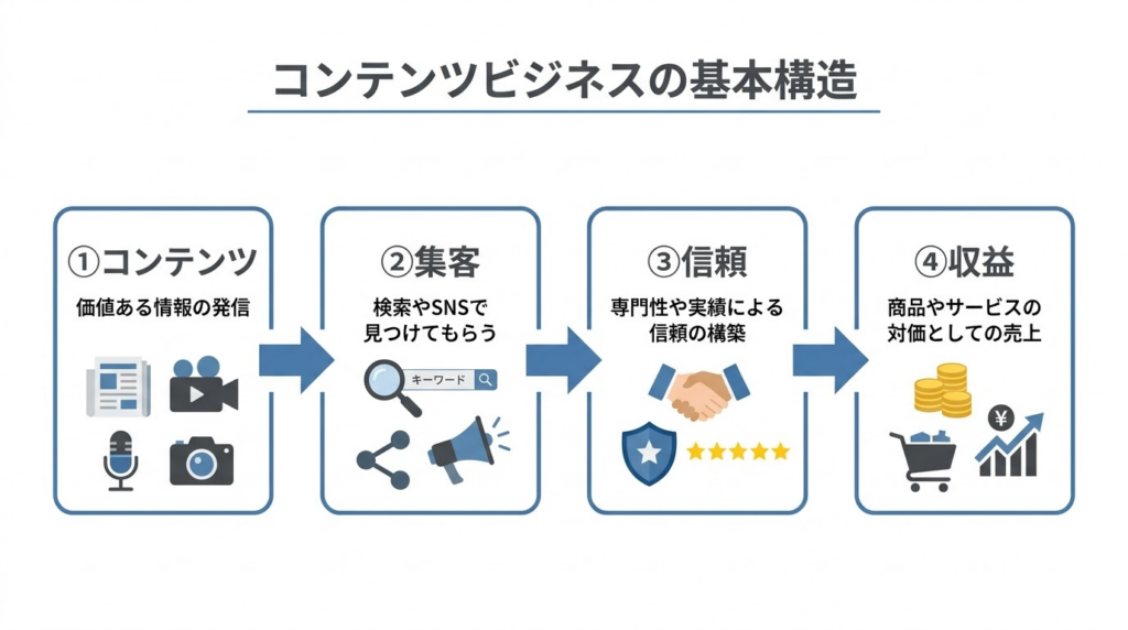 • コンテンツビジネスの基本構造(集客 → 信頼 → 収益)