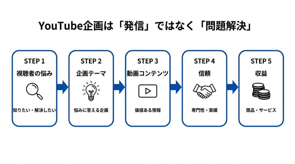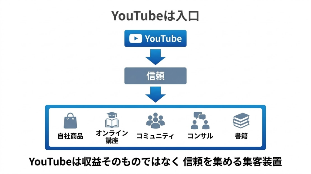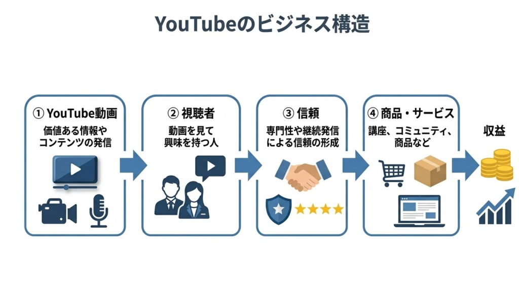 第1章で確認した通り、YouTubeは単に動画を投稿して終わる場ではなく、視聴者を集め、信頼を築き、その先の収益につなげるための集客装置です。