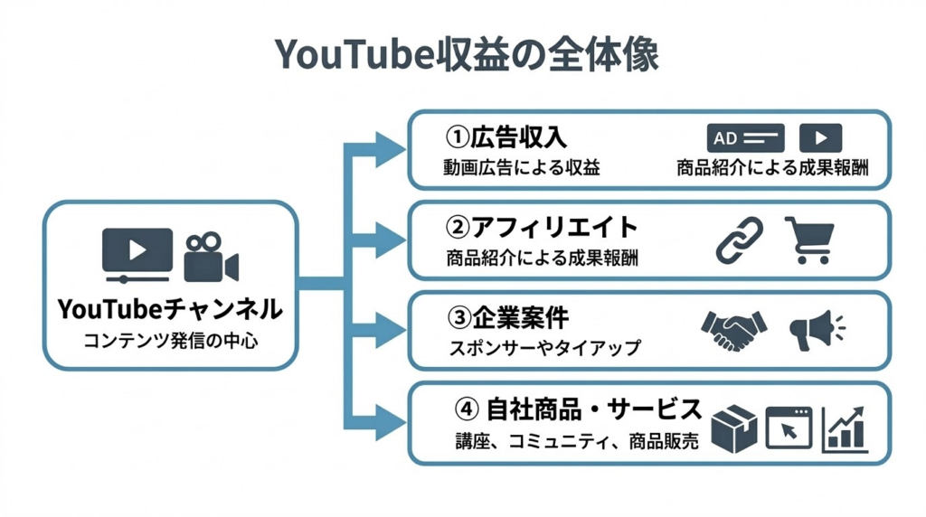 しかし実際には、再生数だけで収益が決まるわけではありません。 YouTubeを軸としたコンテンツビジネスの収益源には、広告収入だけでなく、アフィリエイト、企業案件、自社商品・サービスへの送客など、複数の経路があります。
