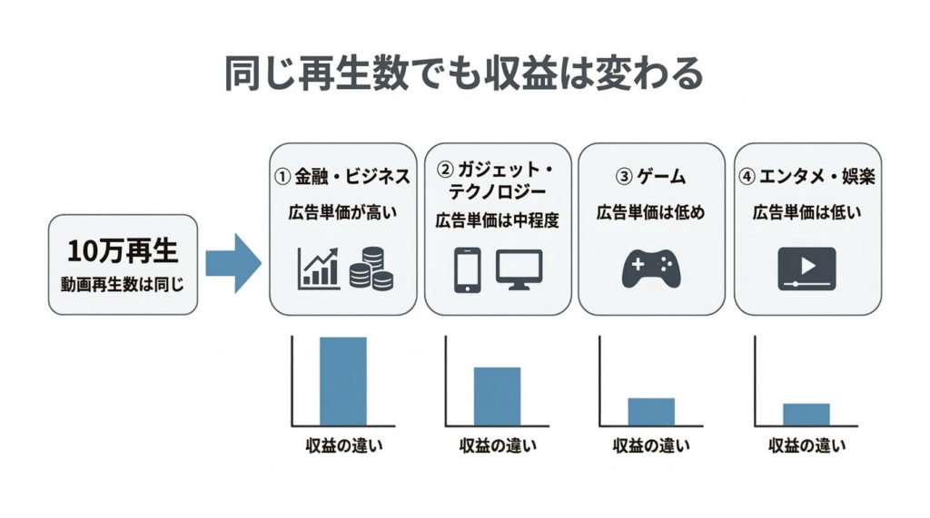 一般的には、1再生あたり数円程度、100万回再生で数十万円程度の収入が発生するケースが多いとされますが、実際の単価は一律ではありません。広告単価(CPM)はジャンルや視聴者層によって大きく異なり、金融・ビジネス系のように広告主が高額を払いやすい分野では高く、ゲームやエンタメ系では低くなりやすいです。