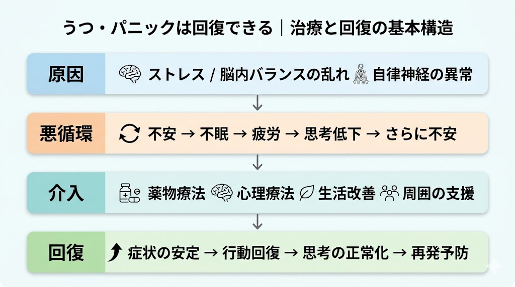- 本質理解:うつ・パニックは脳内物質や自律神経の乱れによる医学的疾患