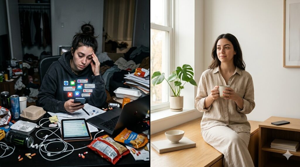 健康は「足す」より「削る」が効く。夜更かし(睡眠不足)、超加工食品、座りすぎなど現代の“過剰”を取り除くことで、体調・体重・集中力は大きく改善する。科学的根拠と具体的な実践法を解説。 -